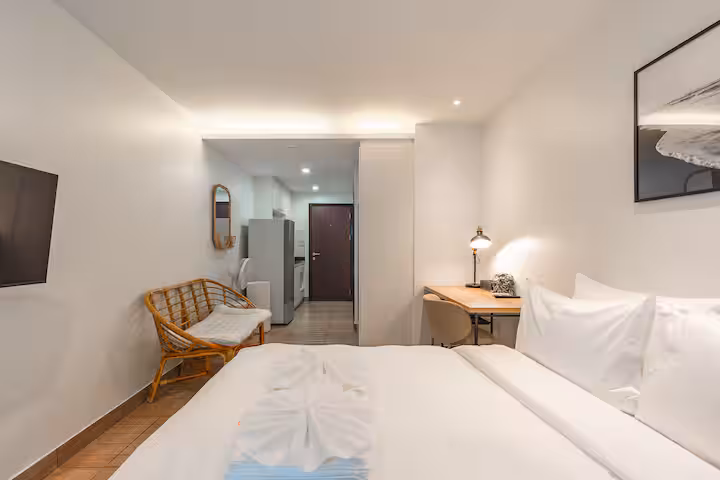 • Bright, air-conditioned studio with a comfy bed and dedicated work desk