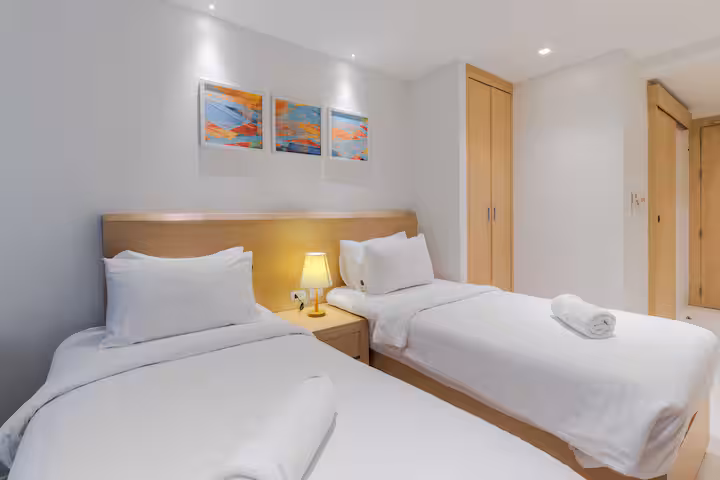 – 2 comfy single beds with pool view