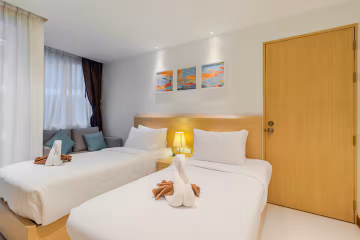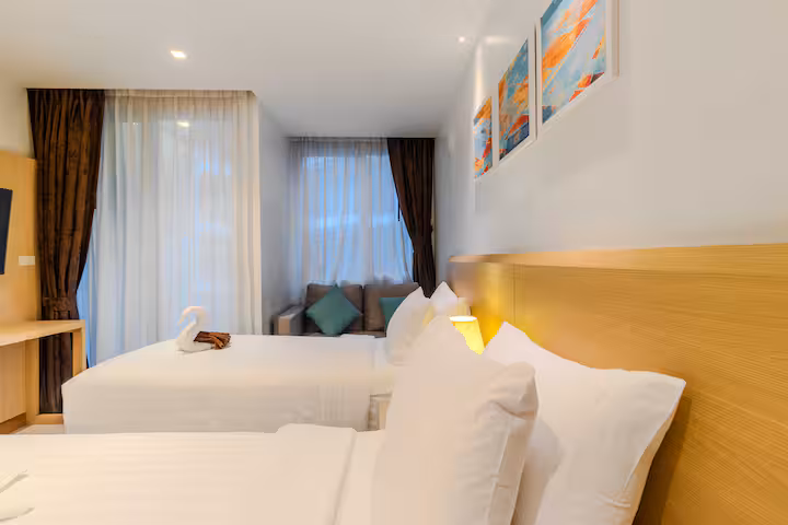 Discover relaxed coastal living at Ocean Breeze Stay, a comfortable pool-view suite inside The Beachfront Hotel Phuket. This space is designed for easy mornings, chilled afternoons, and restful nights — ideal for couples, friends, or solo travelers seeking a peaceful island base.