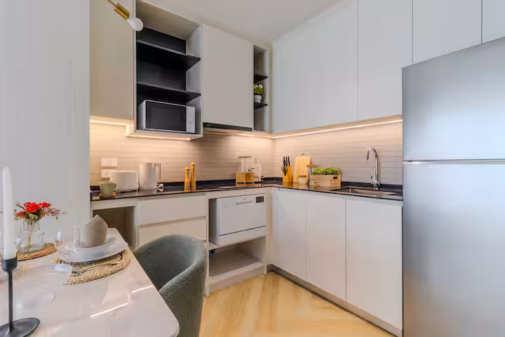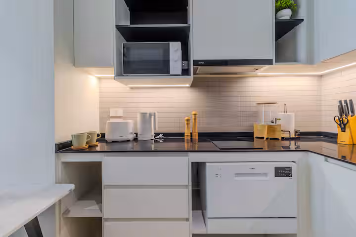 You’ll find a cozy bedroom for restful nights and a living area that opens to a private balcony with a pool view — a lovely spot for coffee or a quiet evening. The kitchenette has everything needed for light cooking, and there’s also a washer inside the unit, which is especially convenient for longer stays.